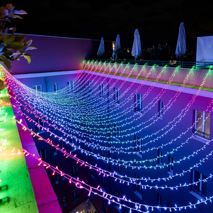 Twinkly-Leuchten fügen sich dank ihres leichten, flexiblen Designs nahtlos in jede Umgebung ein und sind im ausgeschalteten Zustand nahezu unsichtbar. Dank verschiedener Montagemöglichkeiten können sie frei im Raum positioniert werden. Ein patentiertes Mapping-Verfahren verwandelt jede LED in ein Pixel der finalen Lichtshow.