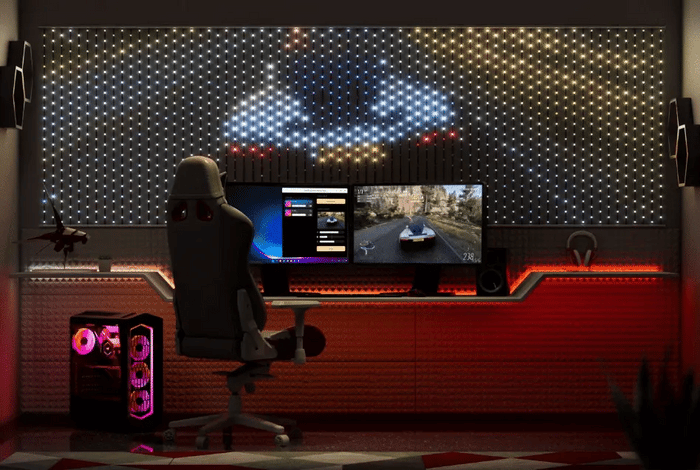 Statten Sie Schreibtische und Regale mit LED-Streifen aus, die eine reaktive Hintergrund- und Seitenbeleuchtung bieten, die mit dem Spielgeschehen synchronisiert ist. Erwecken Sie Ihr Spielzimmer mit lebendigen Farbeffekten zum Leben, die die digitale Welt widerspiegeln.