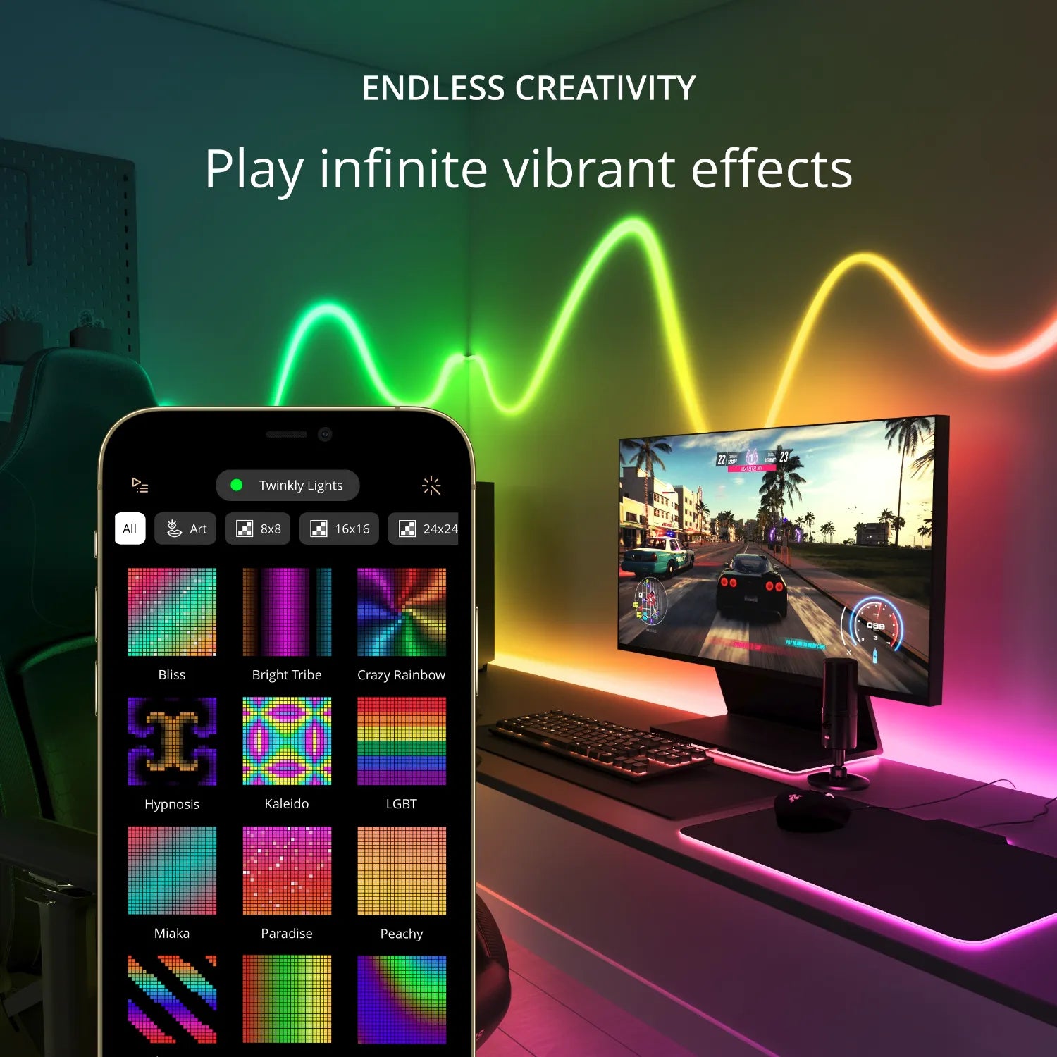 Stellen Sie eine Verbindung zu Twinkly Screen Mirror her oder synchronisieren Sie Flex mit Ihrem Spiel mithilfe der Razer Chroma RGB- und OMEN Light Studio-Integrationen, um ein immersives, reaktionsschnelles Erlebnis zu schaffen.