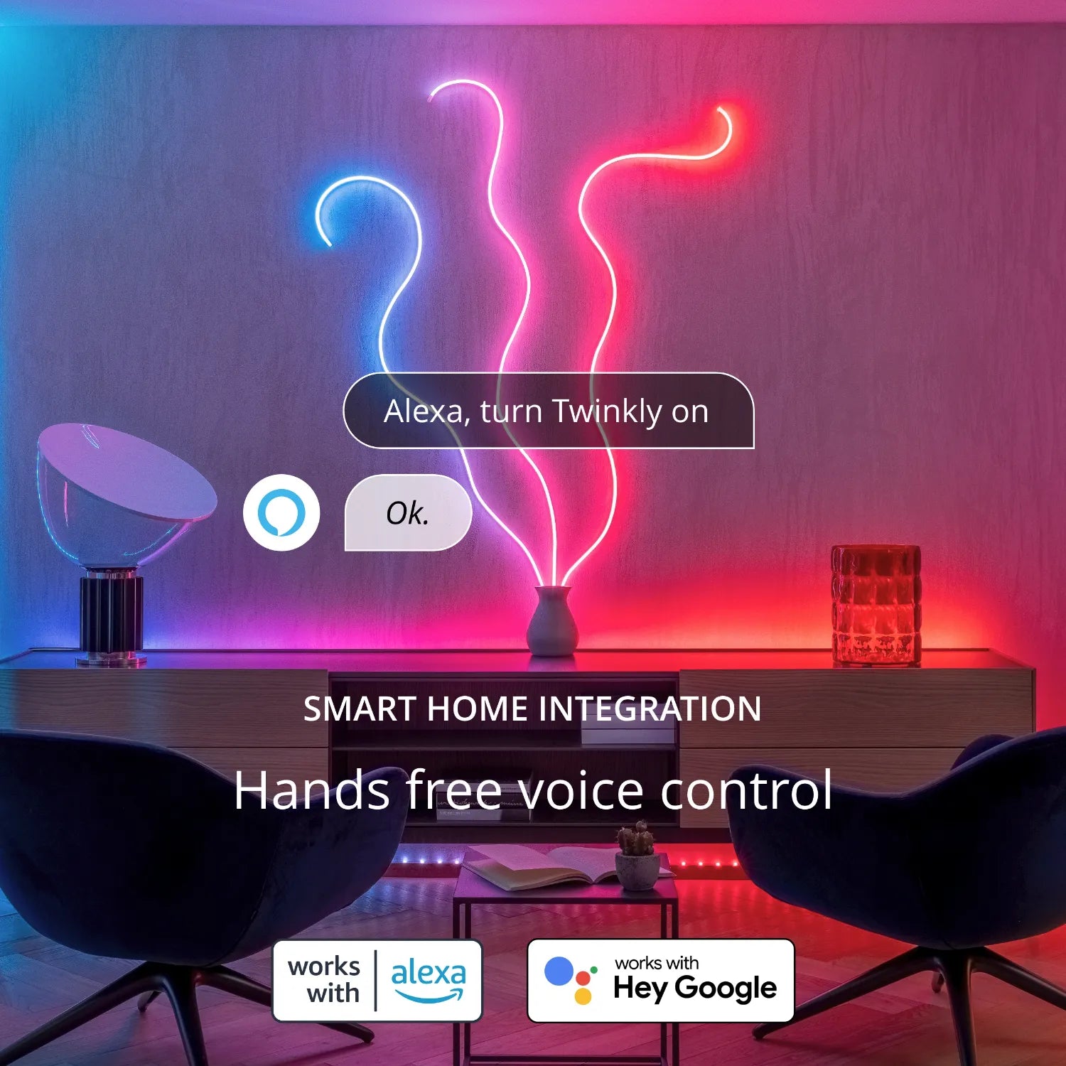 Die intelligente Beleuchtung von Twinkly ist mit Amazon Alexa und Google Assistant kompatibel und ermöglicht eine freihändige Sprachsteuerung.