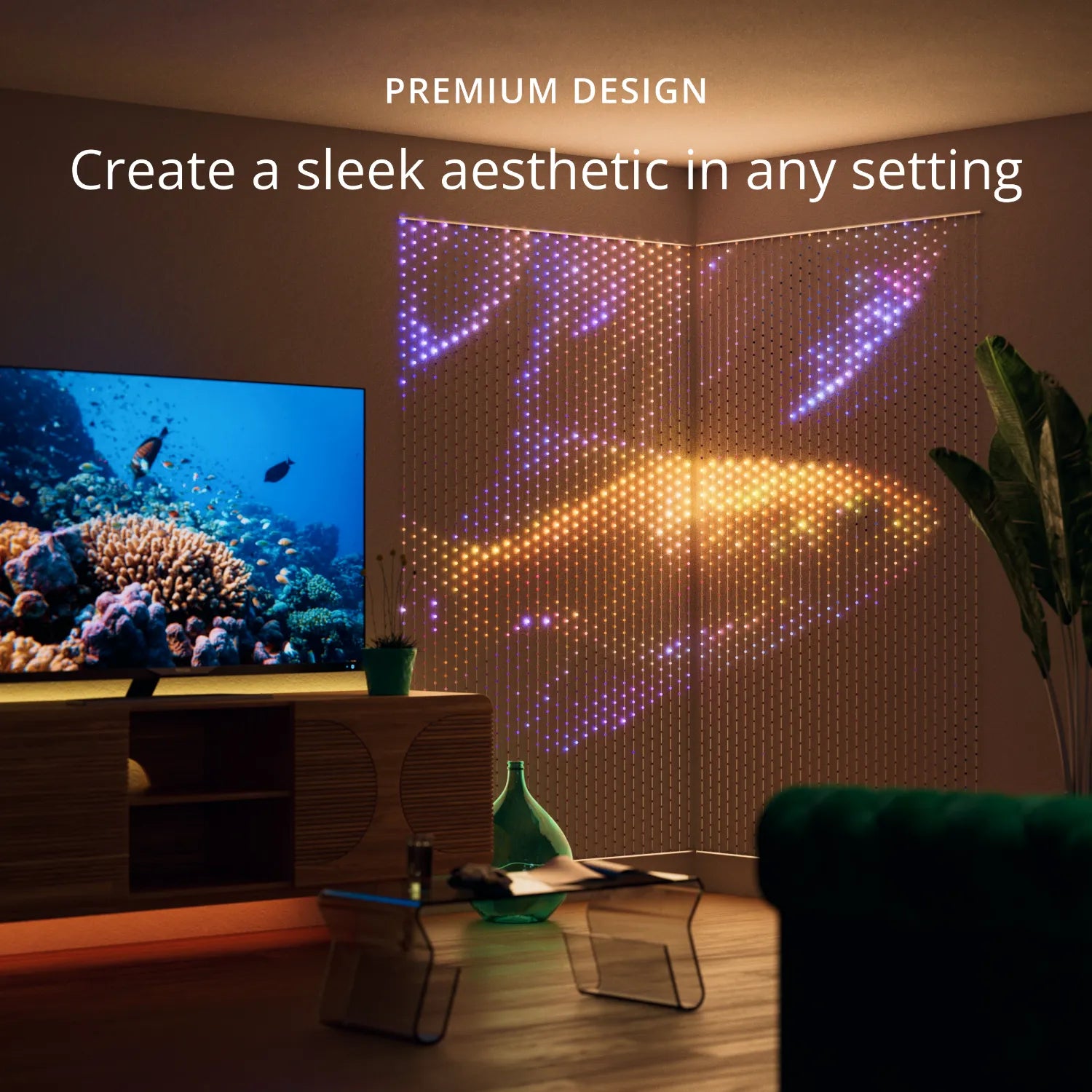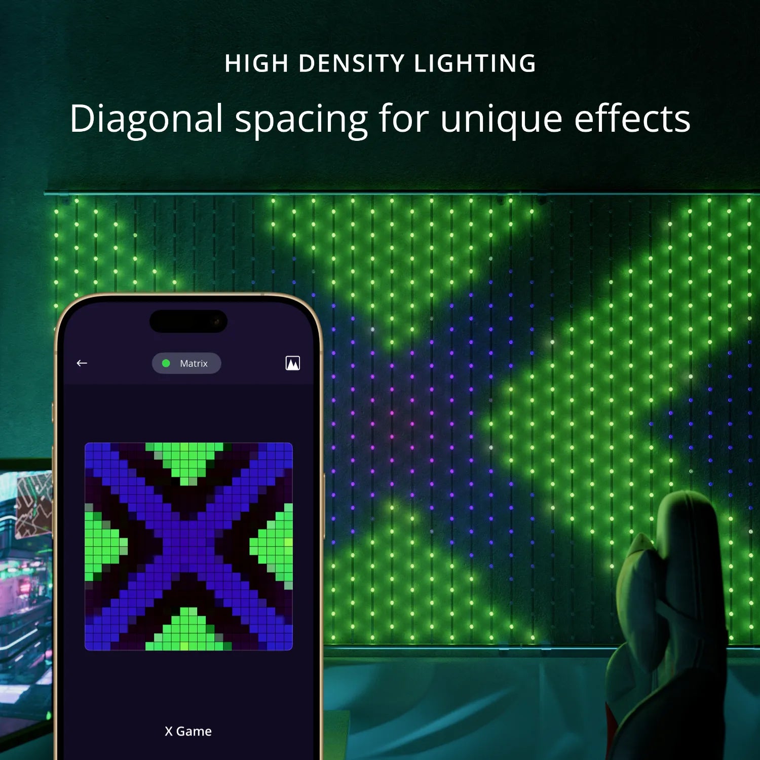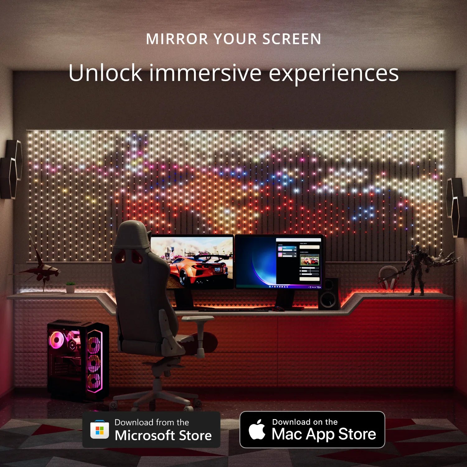Betreten Sie eine neue Dimension intelligenter LED-Technologie mit dem Matrix-Vorhang. Er bietet die höchste LED-Dichte seiner Klasse und präzise LED-Platzierung für nahtlose visuelle Effekte. Dank seines sofort einsatzbereiten Designs und des leichten, hochwertigen Designs fügt er sich nahtlos in jede Umgebung ein. Matrix ist app-gesteuert und vollständig anpassbar, mit unbegrenzten Effekten und Animationen. Bildschirmspiegelungsoptionen (Windows und Mac) und Gaming-Integrationen sorgen für ein beeindruckendes Live-Erlebnis.
