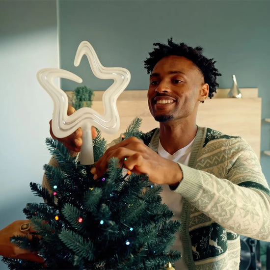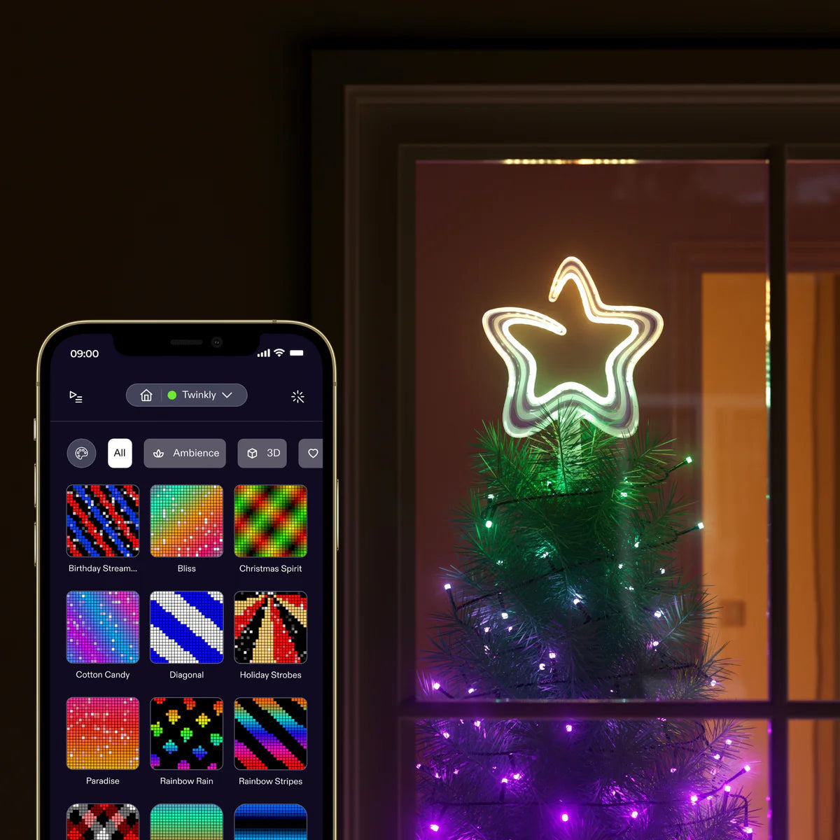 Dieser auffällige, sternförmige Weihnachtsbaumspitzenaufsatz verfügt über 76 intelligente LED-Lichter, die mit unglaublicher Helligkeit leuchten und den perfekten letzten Schliff für jeden mit Twinkly-Lichtern geschmückten Weihnachtsbaum bilden.